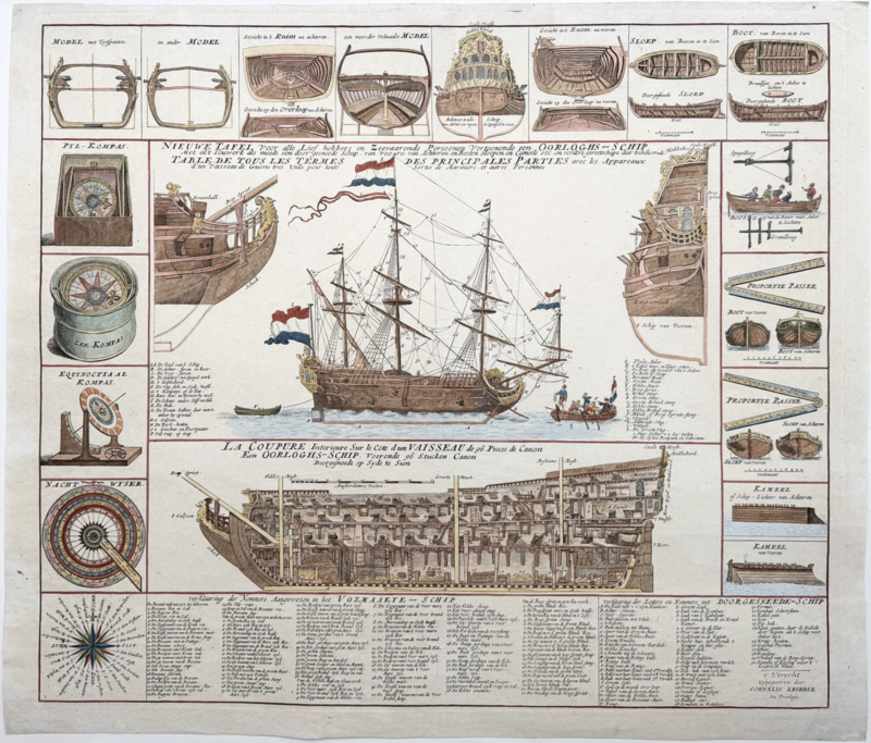 Aanzichten en een verticale langsdoorsnede van een Nederlands galjoen met 96 kanons ["kanonnen" voor landrotten], een driedeks oorlogsschip, "het volmaakte schip" met vol tuigage. Om de afbeeldingen van de schepen heen staan verschillende scheepsmodellen, het hakkebord van een admiraalsschip met het wapen van Amsterdam, een sloep, boot, proportie passer, scheepskameel, peilkompas, zeekompas, equinoctiaal kompas, een nachtwijzer en een kompasroos. Ook de structuur aan de boord wordt nauwgezet opgesomd, van de hoogste officier (Admiraal-Generaal) tot de laagste bediende (soldaten).